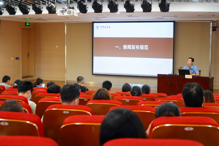 印富贵以《新闻发布规范、意识形态阵地管理和舆情应对与处置》为题,紧贴学校宣传思想工作,条块清晰、以案说法,具体介绍了校园网主页新闻发布的规范和要求,分析了学校上半年意识形态阵地管理情况,强调了舆情应对与处置的原则要求、程序和注意事项。