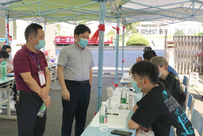 22日上午、下午,校党委书记曹雨平、校长汤正华、副校长朱锡芳在党委办公室/院长办公室负责人陪同下,来到辽河路校区南门报到现场、体育馆核酸检测现场慰问指导。校领导一行听取了相关部门负责人关于疫情防控和返校报到安排等工作情况的汇报,向现场工作人员和志愿者表示亲切慰问;和返校学生及家长亲切交流,细致了解学生返校的具体情况,对家长对学校工作的支持理解表示由衷感谢,叮嘱学生严格遵守学校疫情防控相关规定,做好个人防护。同时,结合即将到来的新生开学等事宜,对报到流程、防疫措施、核酸检测工作作出具体指导。