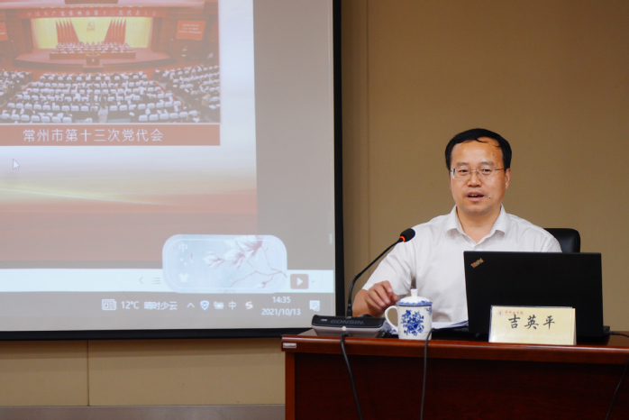 作为常州市第十三次党代会报告起草组组长,吉英平介绍了“强富美高”新常州建设取得的丰硕成果,分析了常州市第十三次党代会报告起草的背景,阐述了党代会报告的主体内容,重点解读了“532”发展战略,为我校人文社科基地更好服务地方建设提供了新思路。