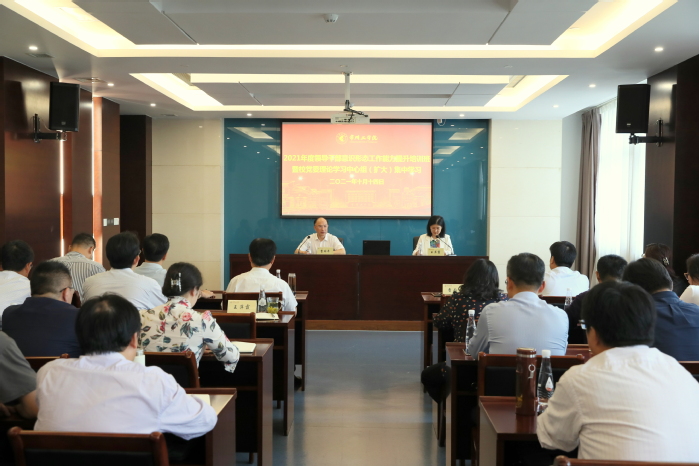 10月14日下午,我校举办2021年度领导干部意识形态工作能力提升培训班暨校党委理论学习中心组(扩大)集中学习,深入学习贯彻落实习近平总书记“七一”重要讲话精神,落实新形势下高校意识形态工作的新任务、新要求,增强全校领导干部意识形态工作责任感和使命感,提升意识形态工作能力和管理水平。全体校领导、相关职能部门负责人及二级基层党组织书记参会。校党委常委、党委宣传部部长王萍霞主持。