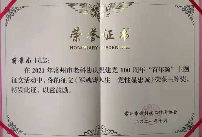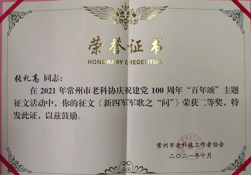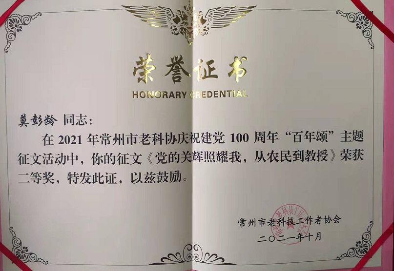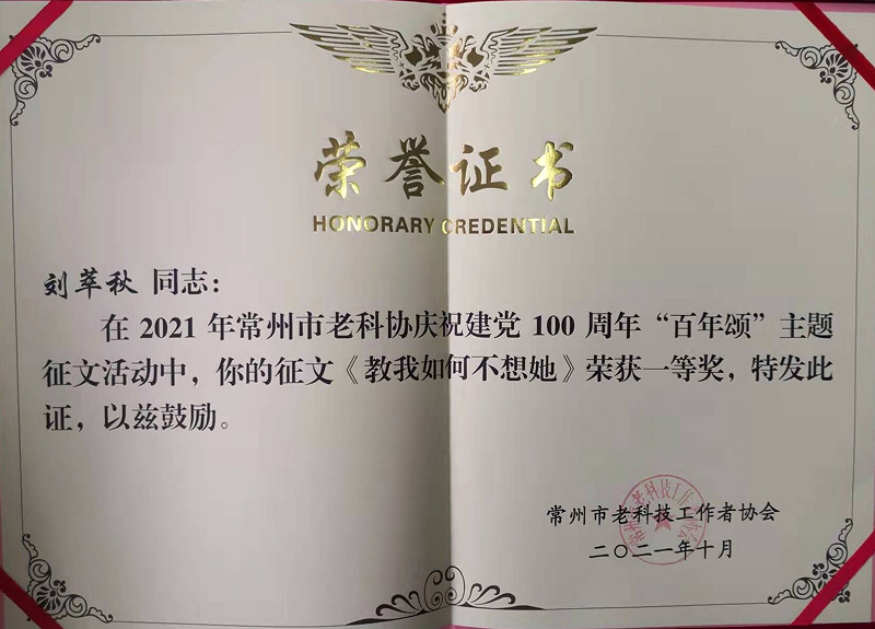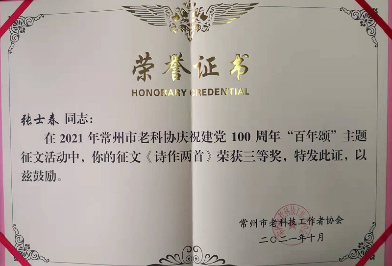10月14日是“老科技工作者日”暨江苏省第34个敬老日,常州市老科技工作者汇聚一堂,围绕“庆祝建党100周年”主题,举行“百年颂”征文颁奖仪式。会上,我校老科协会员创作的5篇作品喜获表彰。其中,刘萃秋的作品获一等奖,张礼高、莫彭龄的作品获二等奖,蒋景南、张士春的作品获三等奖。