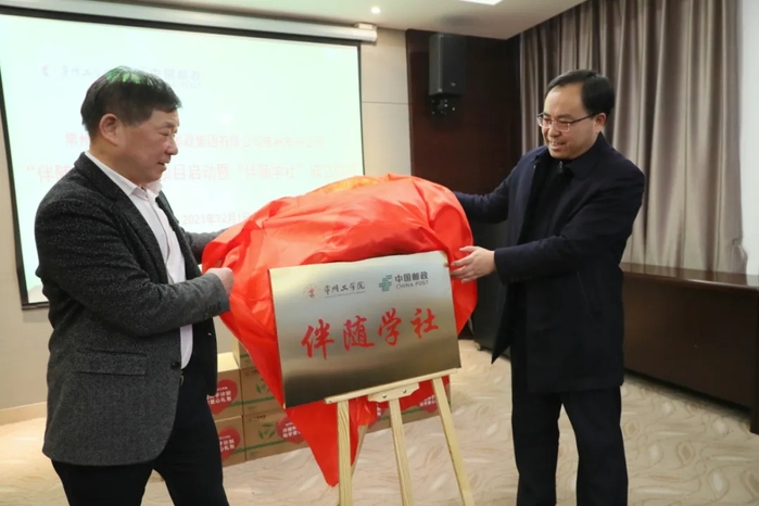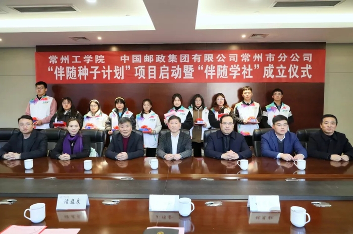 12月1日,我校与常州邮政“伴随种子计划”资助育人项目启动暨“伴随学社”成立仪式在我校举行。中国邮政集团有限公司常州分公司副总经理褚盘良一行,校党委副书记王传金、关工委常务副主任林慧钦、学生工作部(处)处长吕莹璐等,以及伴随学社入选学生参加仪式。仪式由学生工作部(处)副处长王广程主持。