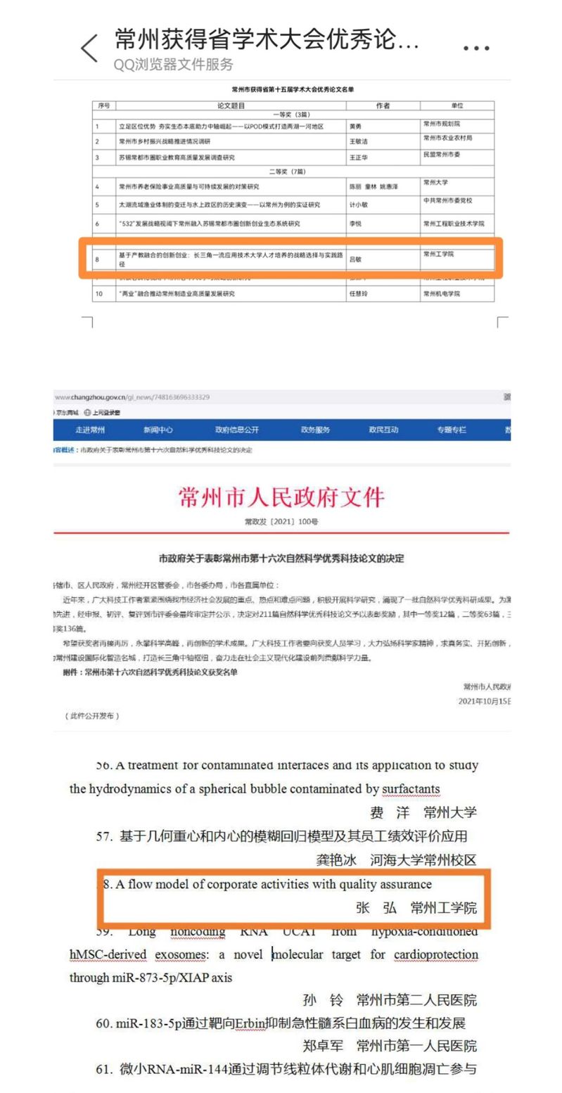 近日,江苏省哲学社会科学界第十五届学术大会经济学与管理学专场在无锡举行,我校创新创业学院教学部主任吕敏等撰写的《基于产教融合的创新创业: 长三角一流应用技术大学人才培养的战略选择与实践路径》获省社科界学术大会优秀论文二等奖。同时,创新创业学院实践部主任张弘发表的《A flow model of corporate activities with quality assurance》获常州市第十六次自然科学优秀科技论文二等奖。
