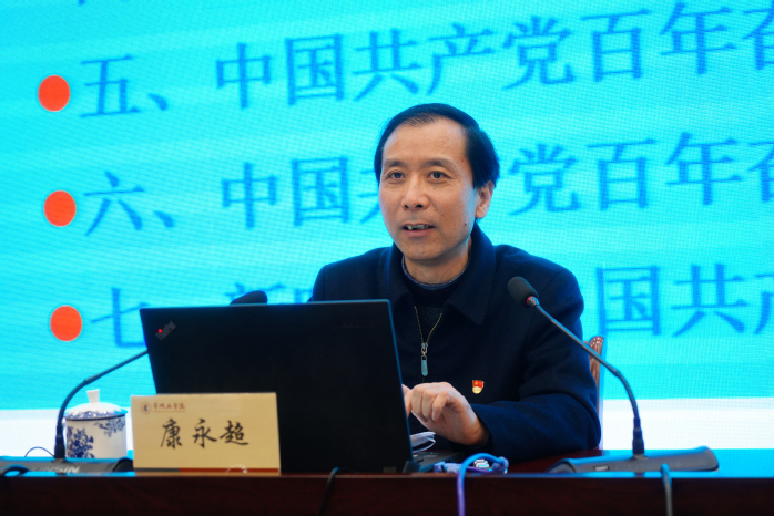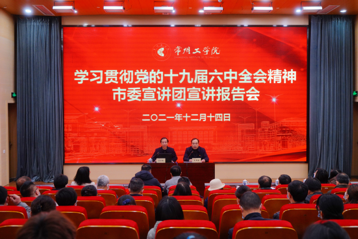 12月14日下午,市委宣讲团成员、常州市委党校康永超教授应邀来校作党的十九届六中全会精神宣讲。校党委副书记王传金主持报告会。校党委理论学习中心组(扩大)全体成员、校党史学习教育领导小组及办公室成员、各部门主要负责人、全体二级基层党组织书记、二级学院院长、马克思主义学院全体教师、“青马工程”学生代表聆听报告。