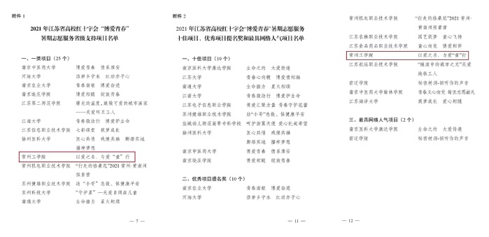 近日,在2021年江苏省高校红十字会“博爱青春”暑期志愿服务项目展示总结活动中,我校人文学院“以爱之名,与爱‘童’行”项目从60个项目中脱颖而出,获提名奖。本次活动由省红十字会、省文明办、省教育厅、省卫生健康委、团省委、新华报业传媒集团、省广播电视总台等部门联合开展。同时,该项目获2021年常州市高校“博爱青春”暑期志愿服务精品项目奖。团队负责人黄河、成员夏佳辉分别获评省、市高校红十字会“博爱青春”暑期志愿服务项目“优秀大学生志愿者”,团队指导老师薛姗、曹鸣谦分别获评省、市高校红十字会“博爱青春”暑期志愿服务项目“优秀指导老师”。