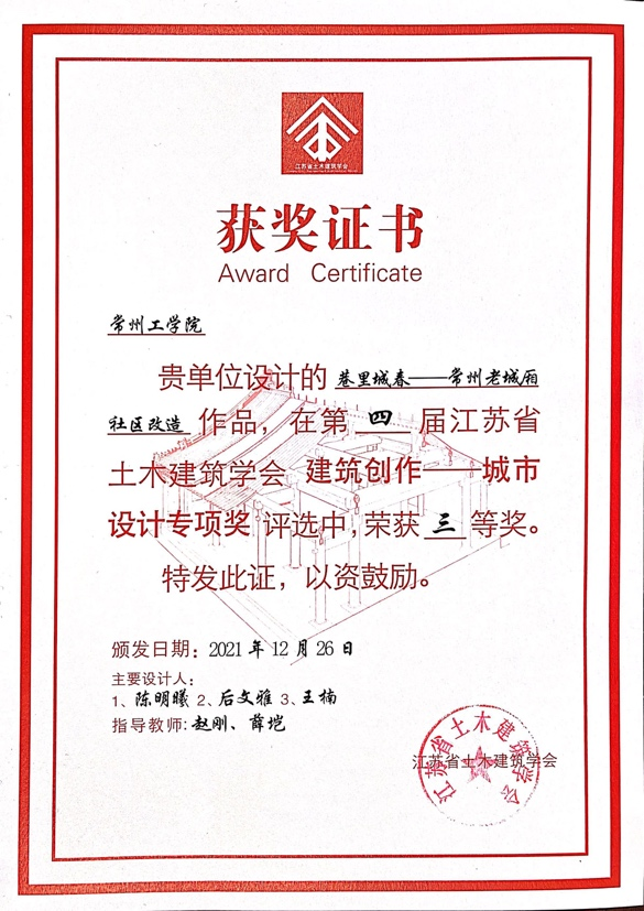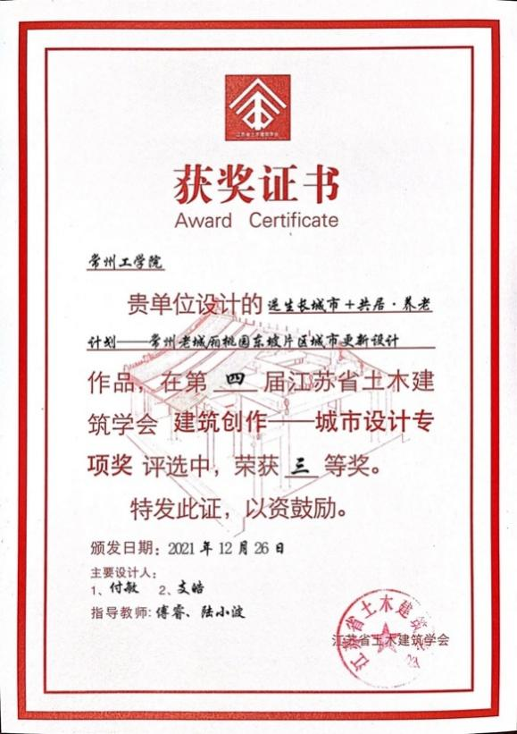 日前,第四届江苏省“建筑创作奖”结果出炉。我校土木建筑工程学院薛垲、傅睿、陆小波指导学生设计的作品《巷里城春——常州老城厢社区改造》(学生成员:陈明曦、后文雅、王楠)和《逆生长城市+ 共居·养老计划——常州老城厢桃园东坡片区城市更新设计》(学生成员:付敏、支皓)均获城市设计专项类三等奖。