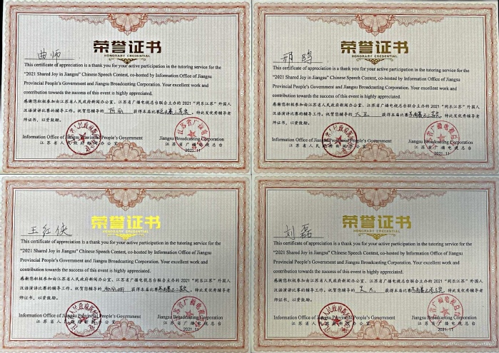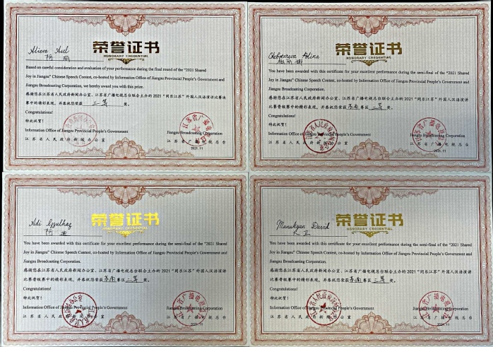 比赛中,我校留学生围绕“学习汉语改变了我的生活”“与中国剪纸来一场约会”“跟我走进青果巷”等主题,字正腔圆、妙语连珠、娓娓道来,展示他们对汉语的热爱、对中国文化的理解,表达了希望疫情结束回到中国继续学习的心愿。经组委会评审,我校留学生ALIEVA ASEL(阿丽)获省总决赛三等奖,CHEBOTAREVA POLINA(柏丽娜)、ADI IZZULHAQ(阿迪)获苏南赛区二等奖,MANUKYAN DAVID(大卫)获苏南赛区三等奖,ZHIGITALIEVA AINAZIK(艾杰)获苏南赛区参与奖。人文学院曲师、王红侠、刘磊,国际交流学院邢鸥被评为“优秀辅导老师”。