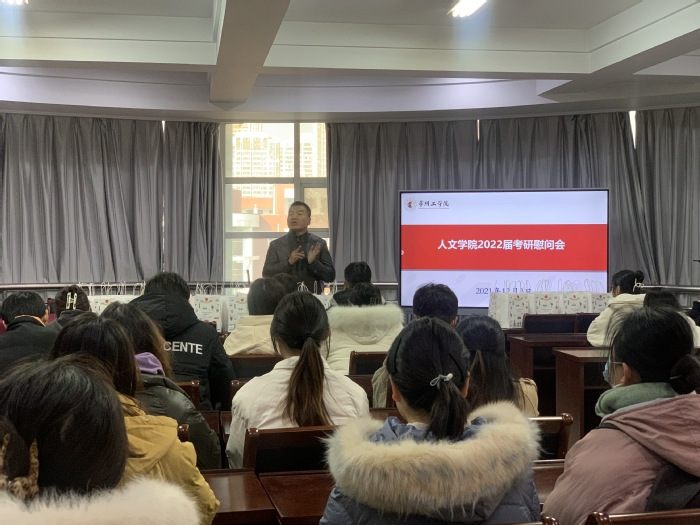 12月3日,人文学院举行2022届考研学生慰问会。院党委副书记曹鸣谦、副院长王振军及50余名考研学子参加活动。