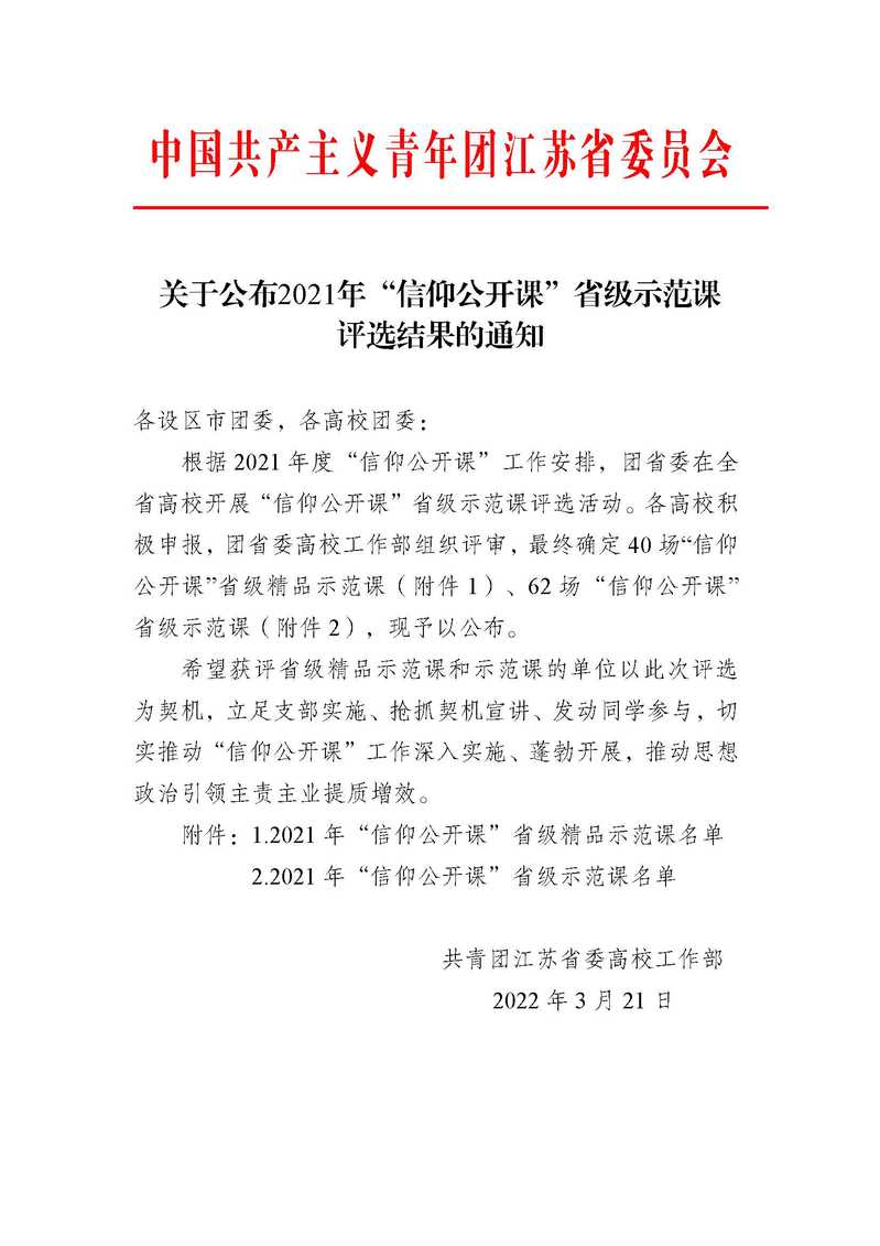 近日,共青团江苏省委公布2021年“信仰公开课”省级示范课评选结果。我校《一名老党员的初心故事》榜上有名。