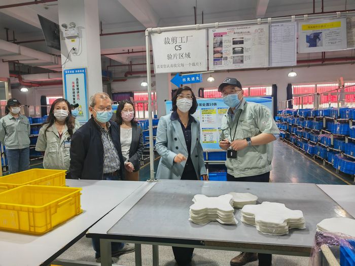 汪群一行在许俊杰的带领下参观了裁剪车间、制作车间和技术研发室等,详细了解企业产品、生产技术、人才需求等情况。