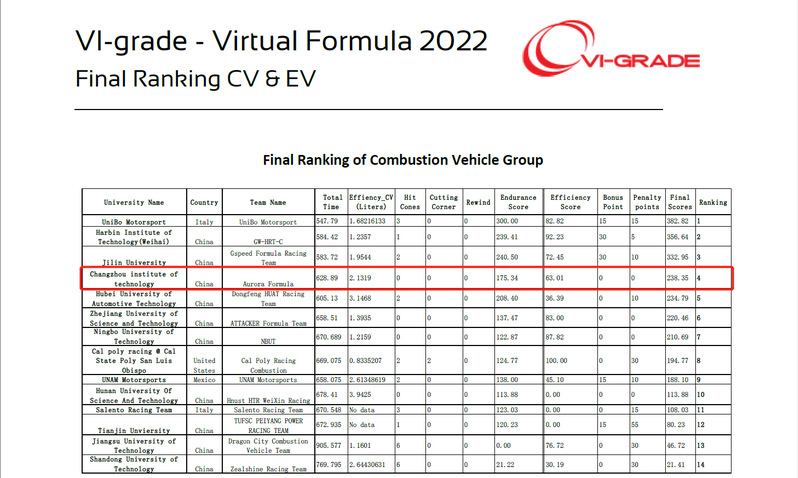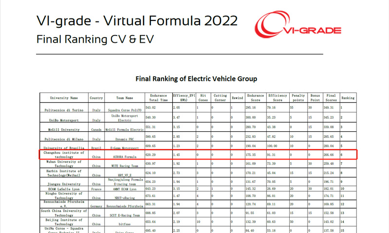 在刚刚结束的第十三届VI-Grade杯世界虚拟大学生方程式竞赛中,经过与来自十多个国家的128支车队的激烈角逐,我校汽车工程学院极光车队获得电车组全球第六(全国第一),油车组全球第四(全国第三)的优异成绩。这是该车队第一次参加此项赛事。