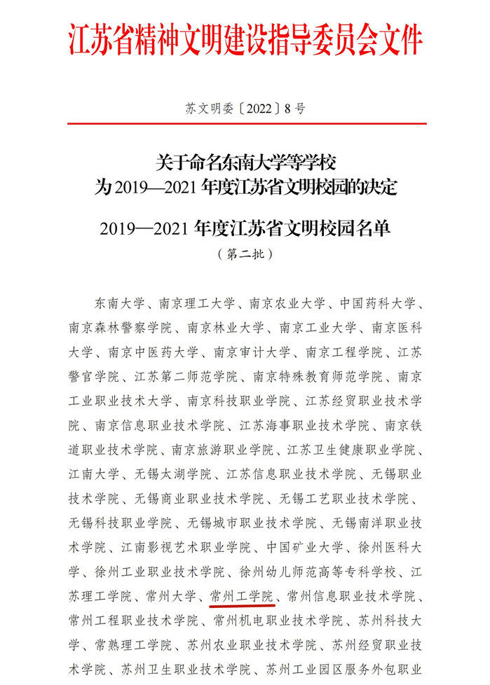近日,江苏省精神文明建设指导委员会印发《关于命名东南大学等学校为2019-2021年度江苏省文明校园的决定》(苏文明委〔2022〕8号),授予一批学校2019-2021年度江苏省文明校园称号,我校再次名列其中。