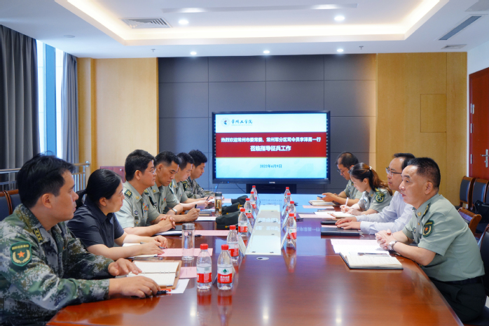 6月9日,常州市委常委、常州军分区司令员李泽勇一行来校调研征兵工作。常州军分区副司令员朱玉荣、动员处处长康志远,天宁区副区长吴小红、天宁区人民武装部政委常素等同行。校党委副书记王传金,人民武装部部长吕莹璐、副部长王广程等参加调研交流。