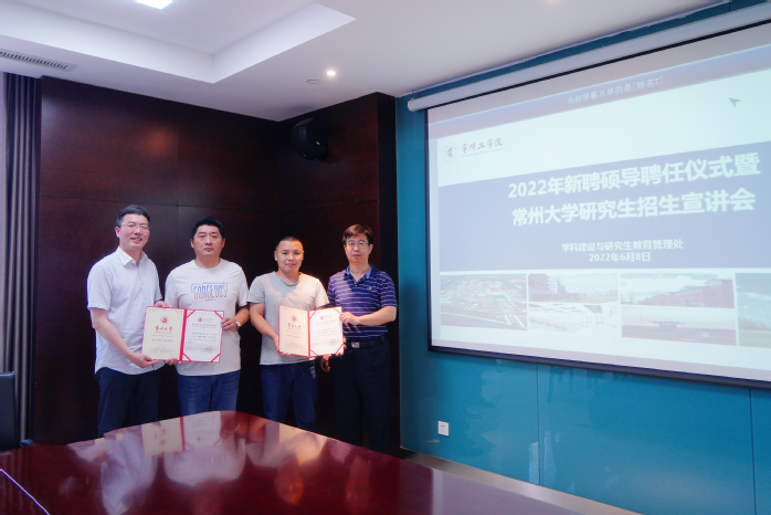 6月8日,常州大学研工部部长柳铭、研究生院院长孟启与相关学位点负责人来校交流,并为我校新聘常州大学硕导颁发聘书。校党委副书记、副校长周全法出席交流会。科研处/学科建设与研究生教育管理处负责人、各二级学院新聘硕导代表参加会议。