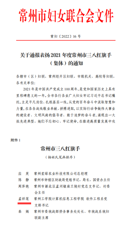 近日,常州市妇联公布《关于通报表扬2021年度常州市三八红旗手(集体)的通知》。我校计算机信息工程学院孟祥莲博士名列其中。全市共31名巾帼先进典型获此荣誉。