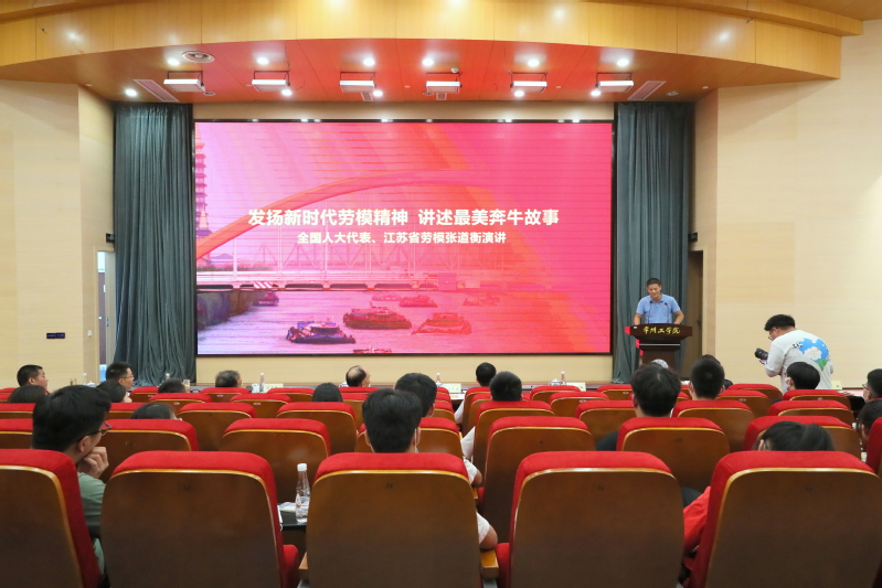 曹雨平致辞时表示,此次报告会是对习近平总书记多次强调的“要礼赞劳动创造,讴歌劳模精神、劳动精神、工匠精神”最认真最直接最现实的践行。近年来,我校以建设一流应用技术大学为奋斗目标,落实立德树人根本任务,把劳动精神融入学生培根铸魂的全过程,致力引导广大师生讲好爱党爱国的“真心话”,讲好立德树人的“中国话”,讲好贡献地方的“常州话”,倾力铸造常工学子献身行业、忠诚企业、热爱岗位的精神特质。曹雨平指出,“劳模工匠进校园 思政教师进企业”与《奔牛有故事》两个重大校政合作项目课题是常州市总工会、奔牛镇与我校三方汇聚众智、合作共赢的创新性举措,能进一步树立“双进”活动品牌,提升《奔牛有故事》项目的影响力,引领更多师生争当新时代劳动模范,实现 “1+1>2”的良好效应。曹雨平特别感谢张道衡来校作主题演讲,以自身的奋斗经历诠释劳模精神,给广大师生一次精神洗礼。