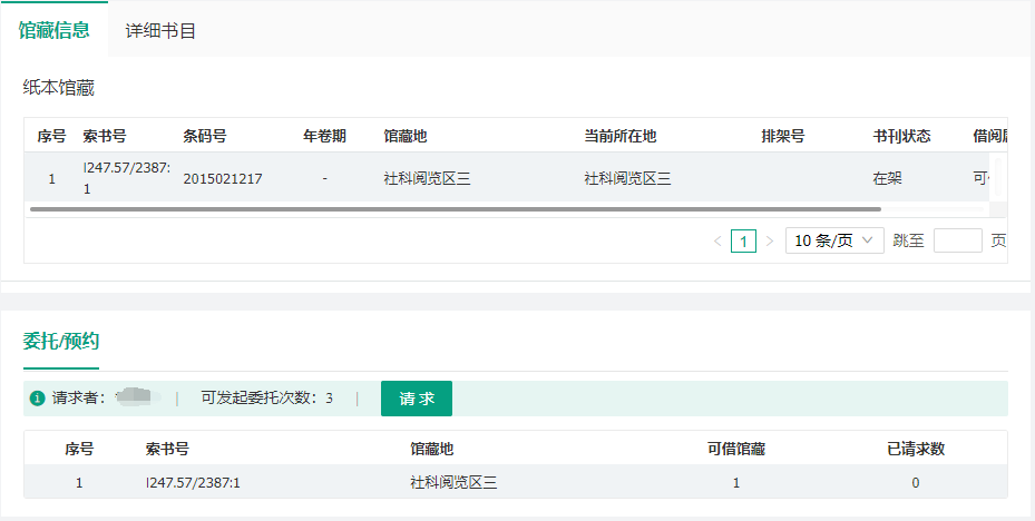 2.2 确定需要委托借阅的图书,通过书目详情页下方的“委托/借阅”栏目,发起委托请求。
