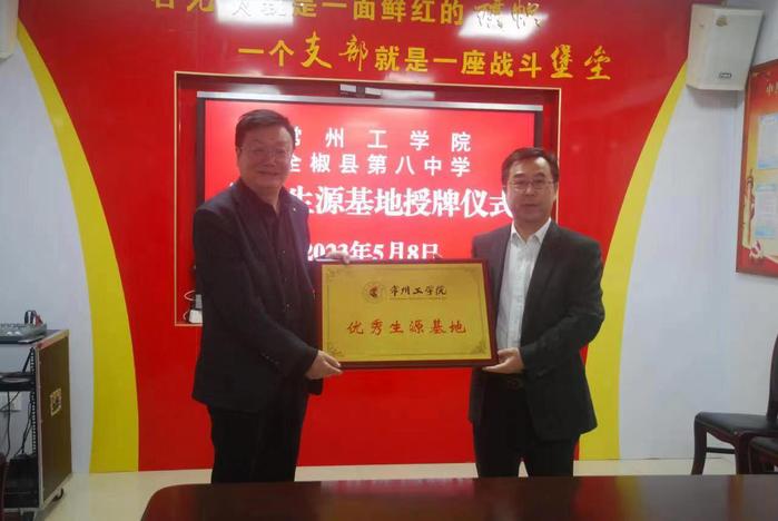 5月8日,校党委副书记王传金、校纪委书记张金贵带队赴安徽省全椒县第八中学,双方签订《常州工学院生源基地中学合作共建协议书》,张金贵为该中学授牌“常州工学院优秀生源基地”,这也是我校建立的第一个省外优秀生源基地。王传金介绍学校基本情况,感谢该中学对我校招生工作的大力支持,希望以本次签约为契机,推动双方进一步合作。
