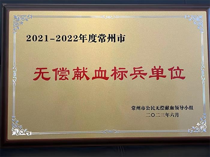 6日14日,常州市公民无偿献血领导小组召开全市无偿献血工作会议,下发《关于通报表扬2021-2022年度无偿献血先进集体的通知》。我校荣获“常州市无偿献血标兵单位”荣誉称号。