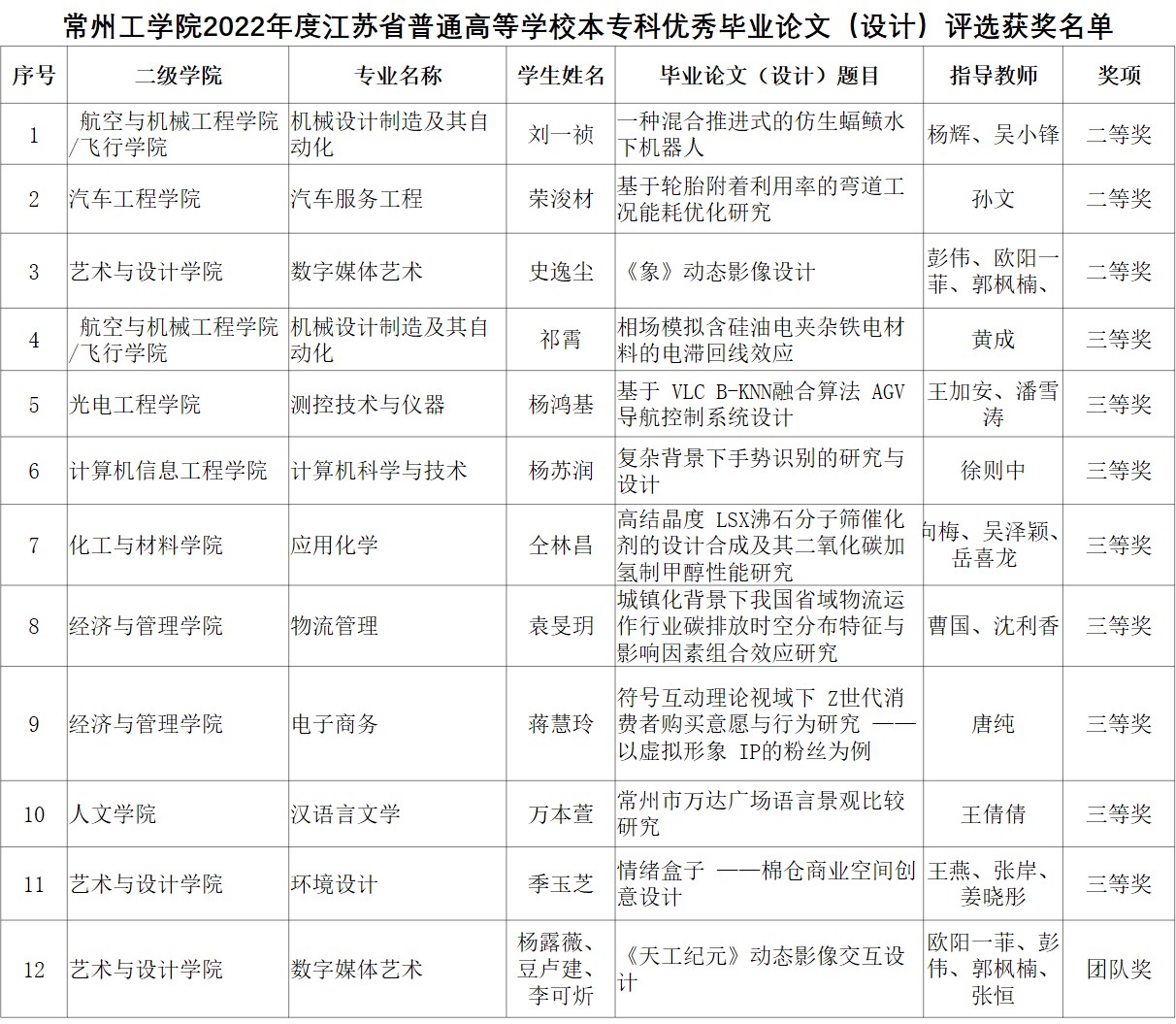 近日,江苏省教育厅公示2022年普通高等学校本专科优秀毕业论文(设计)评选结果。我校获奖12项。其中,二等奖3项(创历史新高)、三等奖8项、团队奖1项,为历年来最好成绩之一。