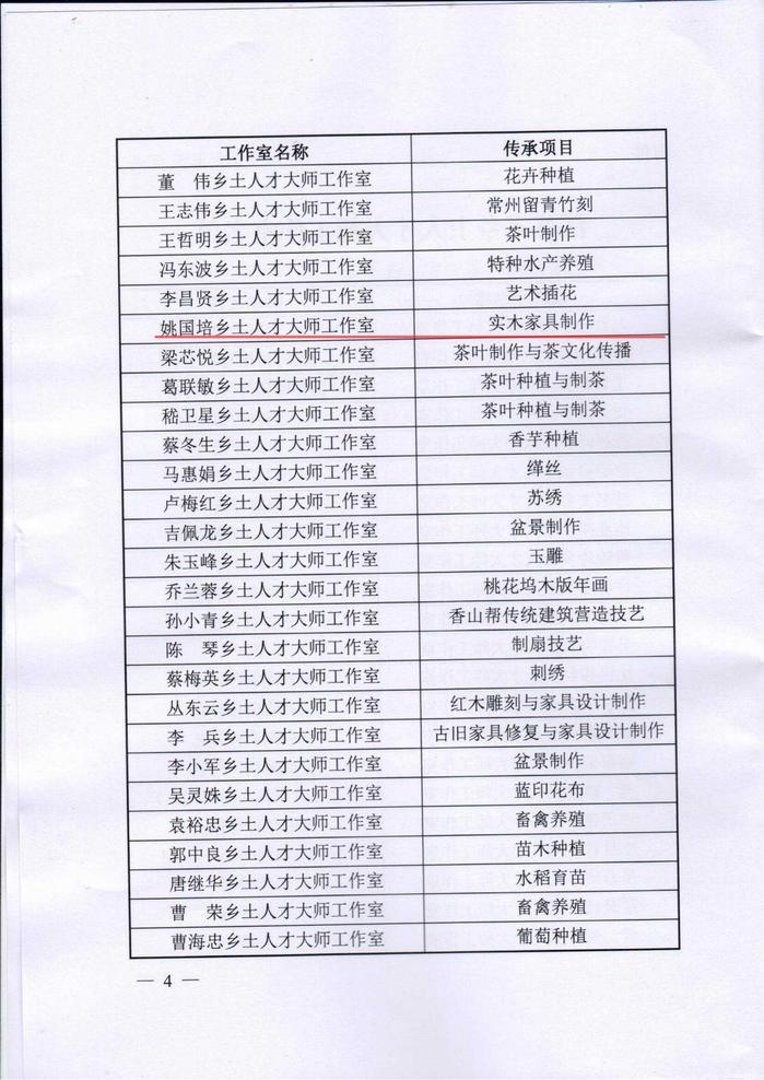 据了解,江苏省乡土人才大师工作室是指江苏省范围内在传统工艺、现代农技、经营管理等领域掌握特殊技艺的能工巧匠、善于开拓创新的经营能人、拥有一技之长的生产能手,依托企业、院校等单位创办或领办,进行技艺技能传承与创新、技术成果运用与推广,加强乡土人才培养的载体平台。姚国培乡土人才大师工作室依托他创办的戴胜家具(医养家具、教科家具、办公民用家具),多年来致力于带领技艺传承、带强产业发展、带动群众致富,为助力脱贫攻坚、助推乡村振兴提供了强有力的人才支撑。