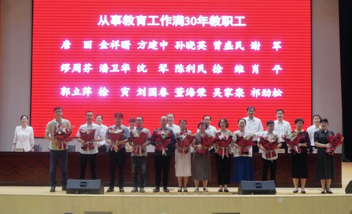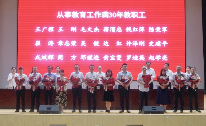 全体校领导、2023年省市校级受表彰人员、从教满30年教职工代表、荣休教职工代表和在校教职工代表共同庆祝节日。校党委副书记王传金主持会议。
