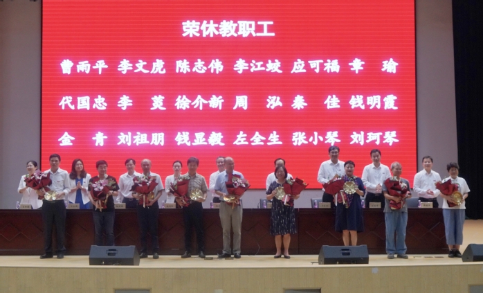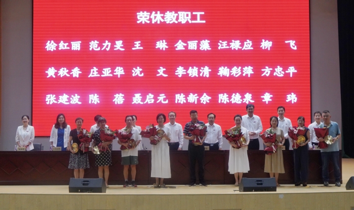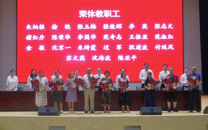 鲜红证书诠师魂,娇艳花蕊传师道。全体校领导依次为江苏省教学名师,常州市师德标兵,2022年度考核优秀记功人员,2023年度校级优秀教师、优秀外籍教师、优秀教育工作者、师德先进个人和集体颁发荣誉证书。青年教师代表为从事教育工作满30年的教职工、荣休教职工献花。为感谢荣休教职工为学校事业发展作出的贡献,学校还为近两年荣休的76位教职工送上“言传身教 孜孜不倦”的纪念匾。
