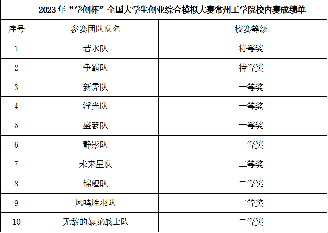 根据《关于举办“2023年“学创杯”全国大学生创业综合模拟大赛校内选拔赛”的通知》要求,校赛参加比赛11支队伍。通过《创业之星》、《营销之星》软件平台模拟比赛,共评选出特等奖2项、一等奖4项、二等奖4项,具体拟获奖名单如下: