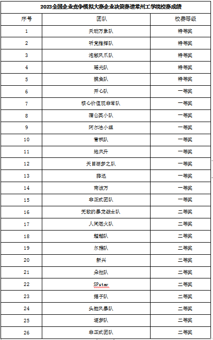 根据《关于举办“2023年全国企业竞争模拟大赛校内选拔赛”的通知》要求,组织决策赛道26支团队进行企业决策模拟大赛校内选拔,共评选出特等奖5项、一等奖10项、二等奖11项,具体拟获奖名单如下。
