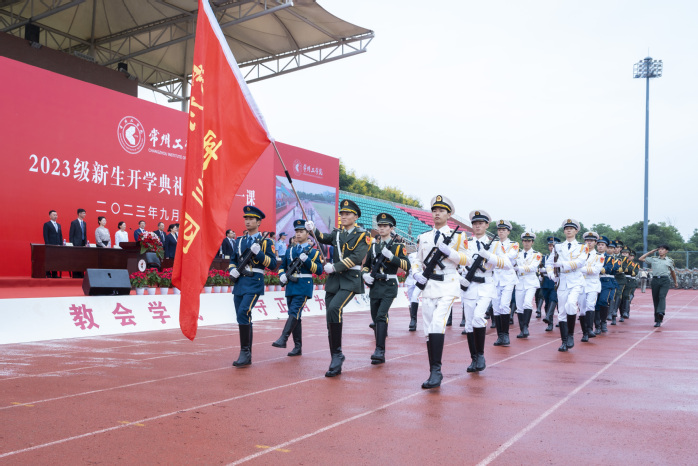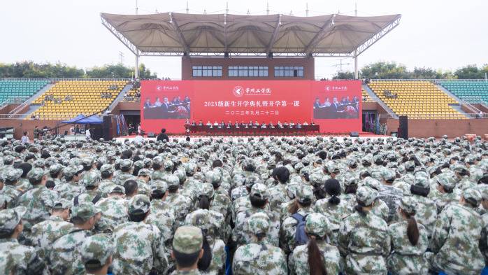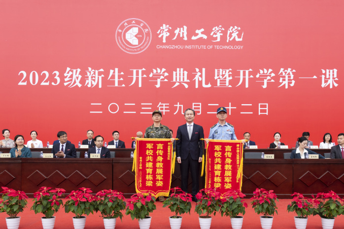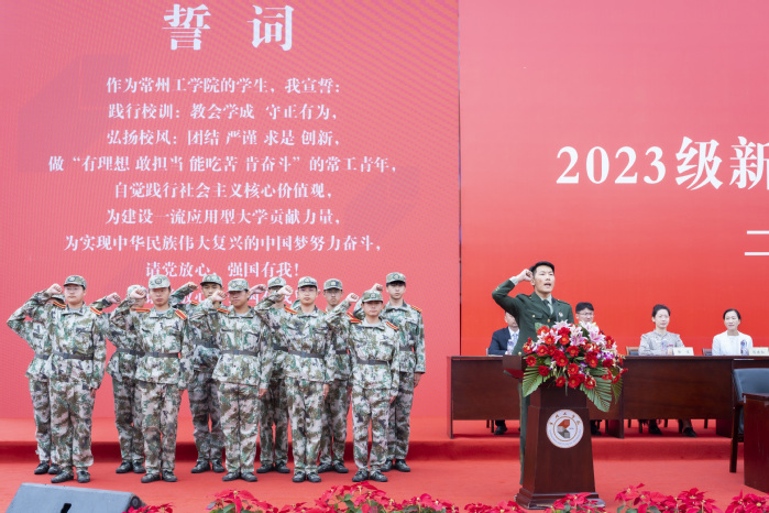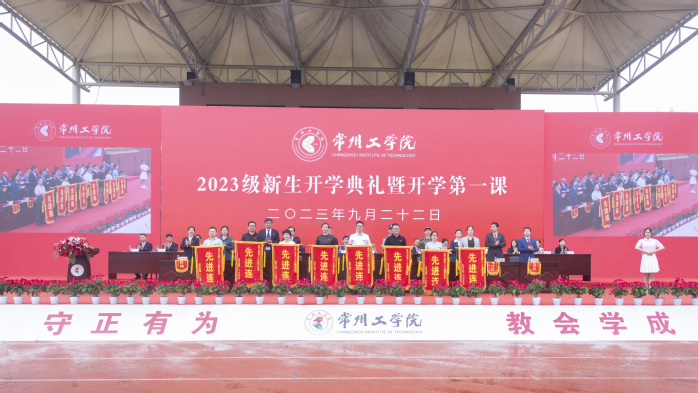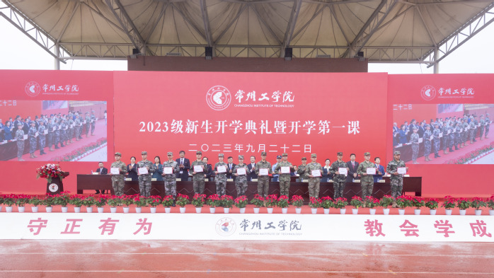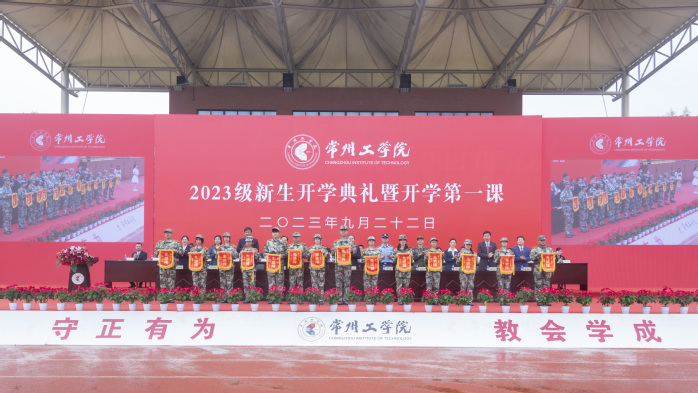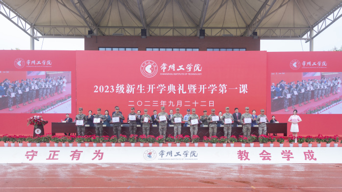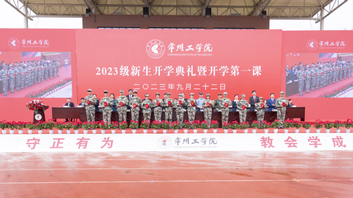 云天收夏色,风雨炼精神。9月22日上午,我校拉满仪式感,在辽河路校区第一体育场举行2023级新生开学典礼暨开学第一课,欢迎4186名新生在常工扬帆启新程。全体校领导,中国人民解放军某部队政治工作处主任石纪委,武警常州支队副参谋长张腾翼,相关职能部门负责人,各二级学院院长、副书记、辅导员,承训部队官兵共同见证。校党委副书记、校长张兵主持典礼。