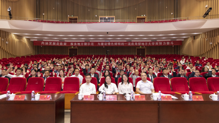 上午9时,大会在庄严的国歌声中开幕。文化艺术中心礼堂里气氛庄严、热烈,大会主席台正中悬挂中国共产党党徽,会场主席台对面悬挂“内涵发展走在前 服务地方做示范 为建设特色鲜明的一流应用型地方大学而努力奋斗”的标语。