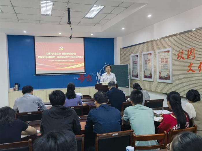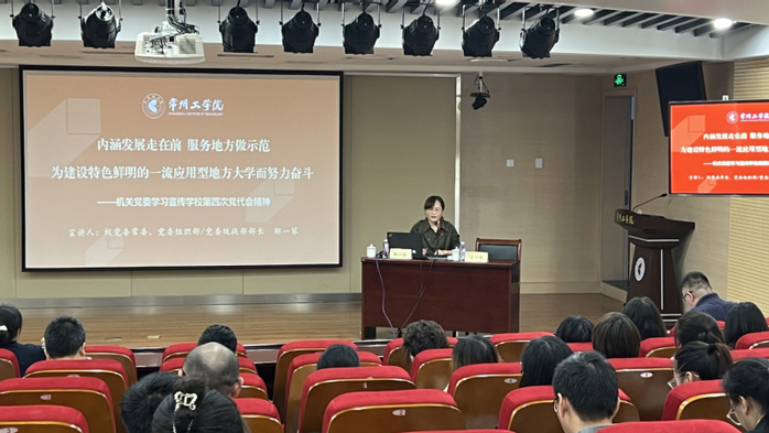 汤正华以《内涵发展走在前 服务地方做示范——为建设特色鲜明的一流应用型地方大学而努力奋斗》为题,进行专题宣讲。他从第三次党代会以来的主要成绩、新发展阶段的使命与奋斗目标、谱写建设特色鲜明的一流应用型地方大学新篇章、持续推进新时代党的建设新的伟大工程等四个方面,对学校第四次党代会精神作了全面、深入、系统的解读。他结合实际,充分肯定了两个学院自第三次党代会以来所取得的成绩及其为学校整体发展作出的积极贡献。同时,他强调指出,面对新的机遇与挑战,大家必须保持清醒,以更高的站位、更大的格局、更清晰的思路、更务实的举措,勇担使命、求实创新,开拓进取、团结奋斗,在特色鲜明的一流应用型地方大学建设中作出更大贡献。