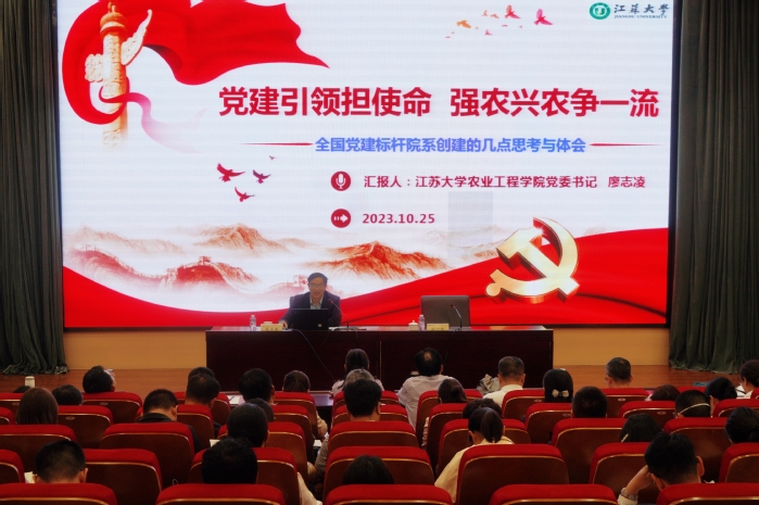 培训班上,江苏大学农业工程学院党委书记廖志凌作题为《党建引领担使命,强农兴农争一流》的全国党建标杆院系创建经验介绍,通过大量的实例讲解了作为第一轮全国“标杆院系”建设单位,在政治统领工程、组织强基工程、思想铸魂工程、文化凝心工程、作风树纪工程等五大工程中的建设成果和经验。