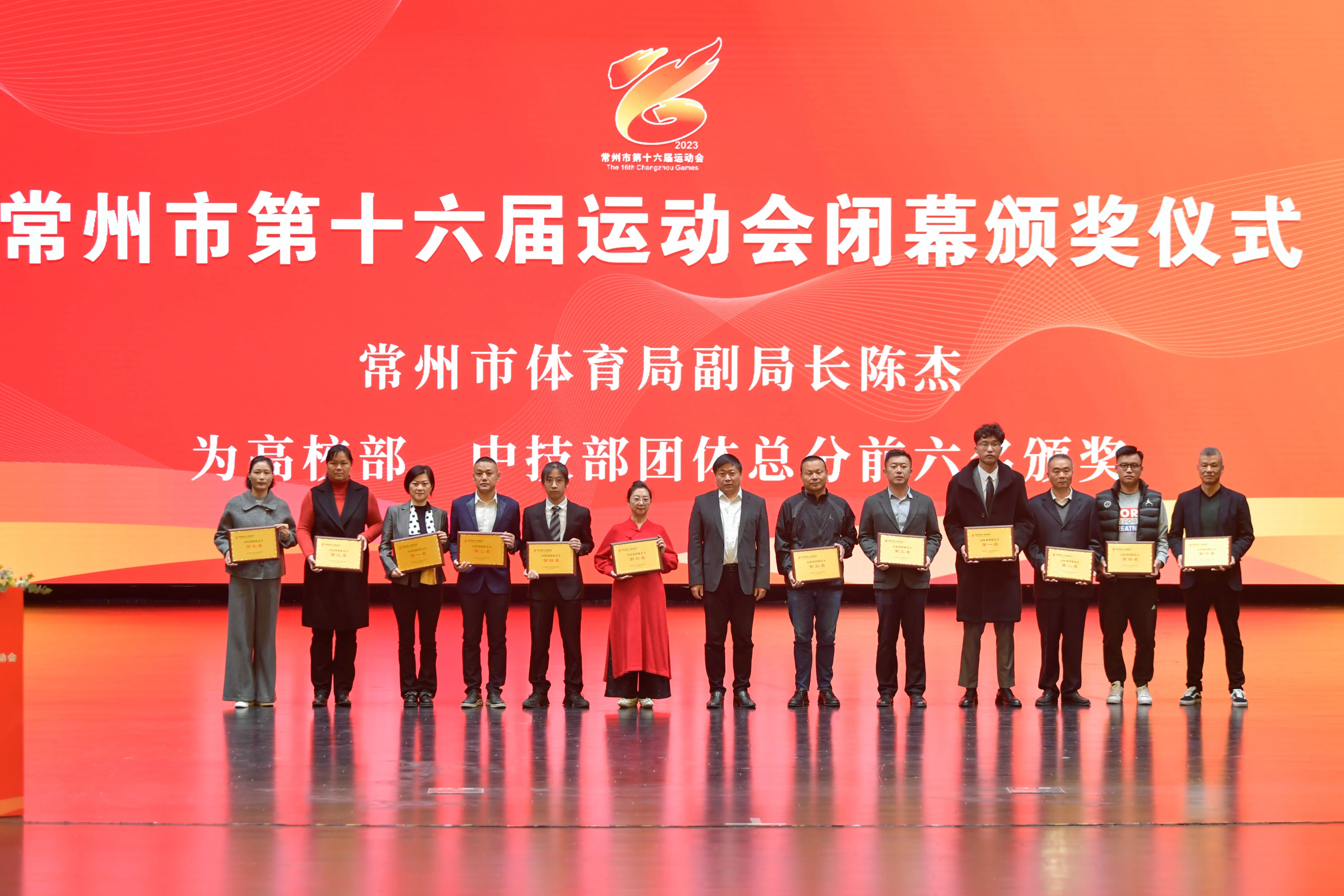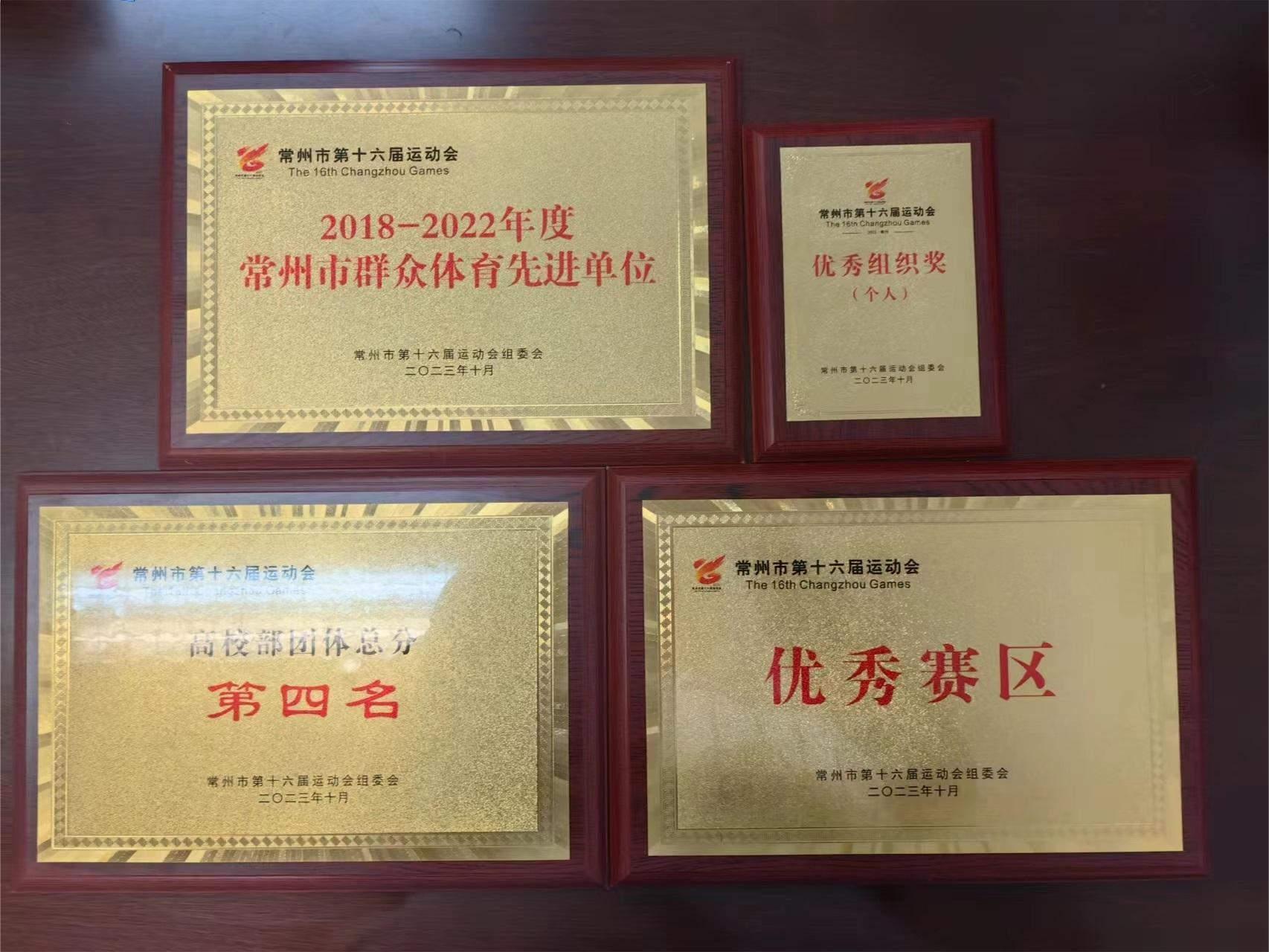 11月11日,从常州市第十六届运动会闭幕式传来喜讯,我校获2018-2022年度常州市群众体育先进单位、高校部团体总分第四名、第十六届市运会优秀赛区等荣誉。同时,体育教学部党总支书记兼主任王红福获优秀组织奖(个人)、第一教研室主任兼支部书记朱亚男获评2018-2022年度常州市群众体育先进个人。