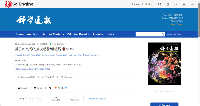 在《基于PT对称的声波超前/延迟线》中,该团队通过研究发现,此PT对称声学系统中两种互补的散射特殊点恰好可以用来实现声学超前线和声学延迟线。增益的引入,打破物理的因果关系,使鲜少报道的声超前线得以顺利实现。张海啸为论文第一作者及通讯作者,电气信息工程学院鲍彧博士为共同通讯作者。