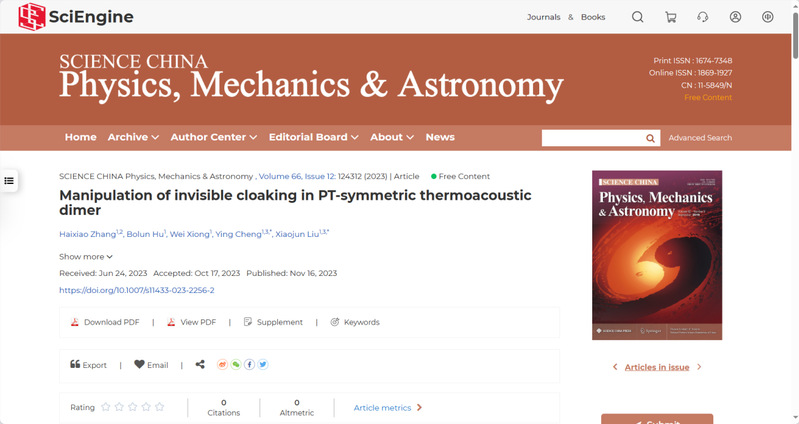 近日,我校电气信息工程学院张海啸副教授及其合作团队在宇称时间(PT)对称声学研究领域取得了重要进展,相关研究成果《Manipulation of invisible cloaking in PT-symmetric thermoacoustic dimer》在《SCIENCE CHINA-Physics, Mechanics & Astronomy》上发表,《基于PT对称的声波超前/延迟线》在《科学通报》上在线发表。