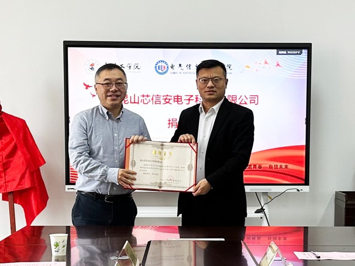 情系学子,寄望未来。12月14日,昆山芯信安电子科技有限公司向我校捐赠集成电路测试分析平台2台(总价值354万元),并与我校共建集成电路设计与测试校企联合实验室。公司董事长王杨、销售副总陈卫杰,校长张兵,电气信息工程学院党委书记李俊生、院长毛国勇,校友联谊会办公室主任、校教育发展基金会秘书长冯平平等参加捐赠仪式。