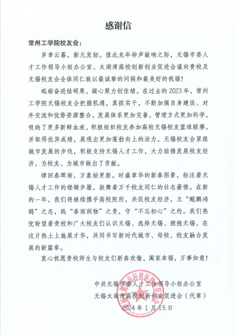 “常州工学院无锡校友会紧跟城市发展的步伐,积极支持无锡人才工作,大力助推发展校友经济,为校友、为城市作出了贡献。”1月15日,中共无锡市委人才工作领导小组办公室向我校发来感谢信,充分肯定我校无锡校友会工作,并表达诚挚谢意。