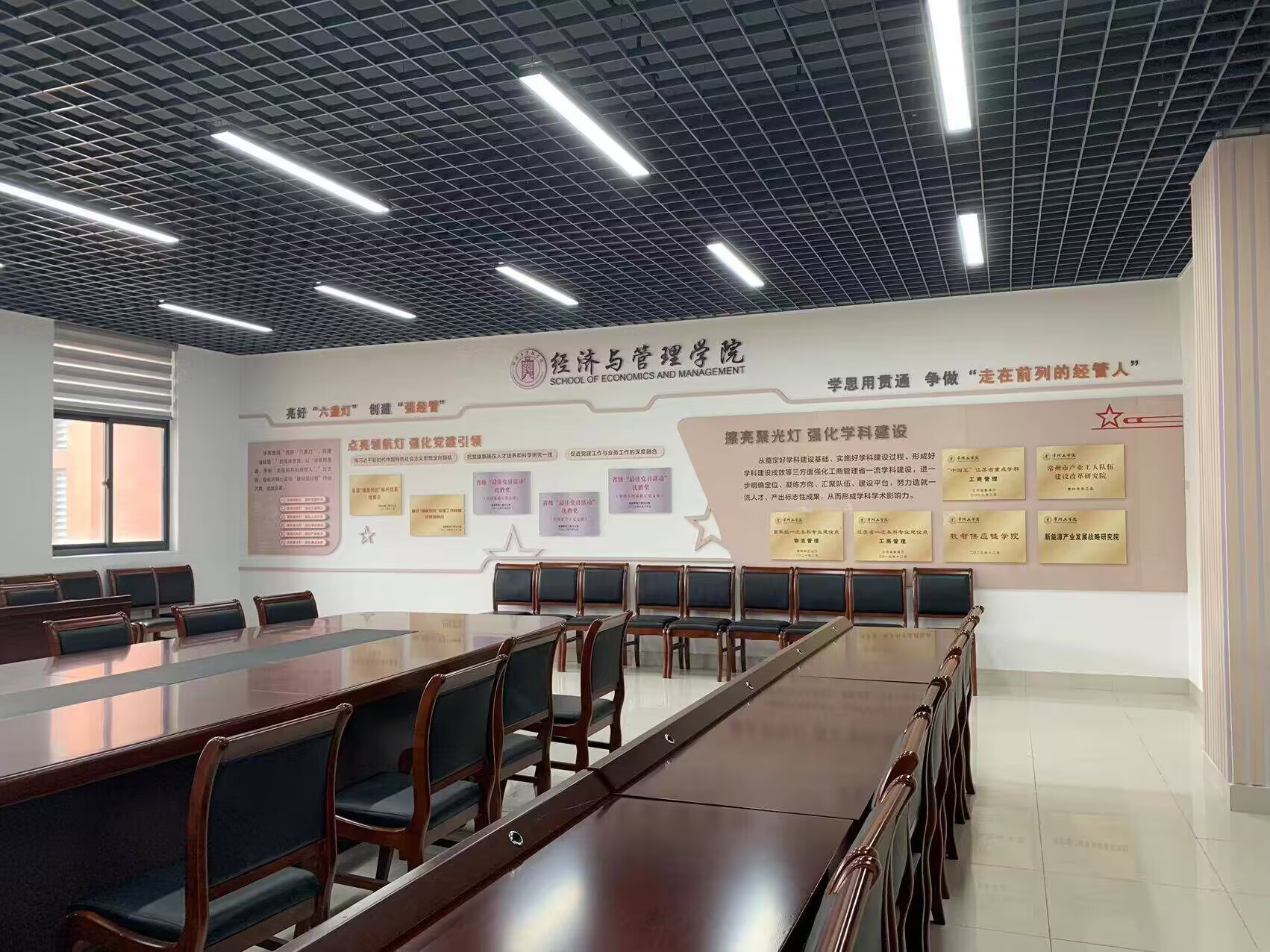 原来,这是两间被9位爱心校友赋能的空间,已内外“上新”、提档升级,目前全面承担起来宾接待、学术交流、人才引进面试、为考研学生提供模拟复试场地等功能。两间会议室不仅设施先进,拥有智能电子屏、最新软件等,而且空间文化设计定位准、品味高:学术报告厅主墙上艺术化地陈列了该院党建工作、学科建设成果和杰出校友风采;会议室主墙上张贴着凝炼了学校第四次党代会精神的标语,与学院文化墙展示的“亮好六盏灯,创建强经管”相呼应……处处潜移默化地发挥着环境育人的作用,赋能师生成长。