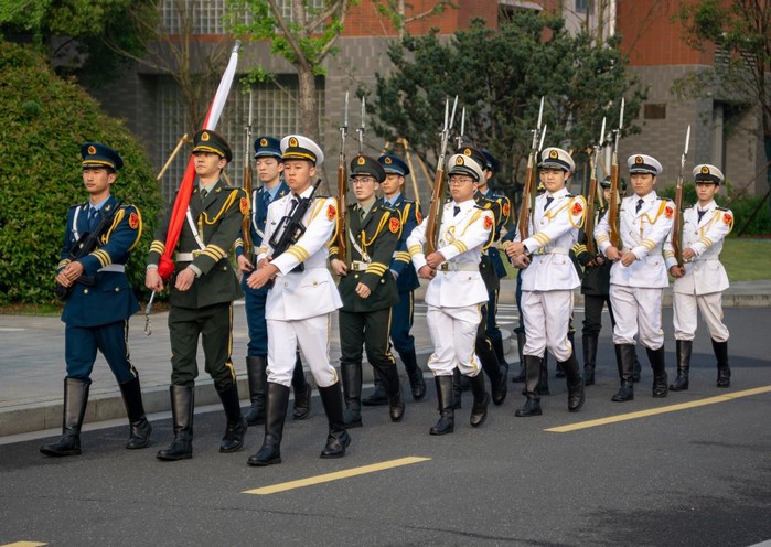 7点整,国旗护卫队成员迈着整齐划一的步伐,护送五星红旗至升旗台。伴随着雄壮激昂的《义勇军进行曲》,鲜艳的五星红旗冉冉升起。全体师生庄严肃立,向国旗行注目礼,齐声高唱国歌。