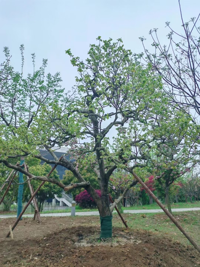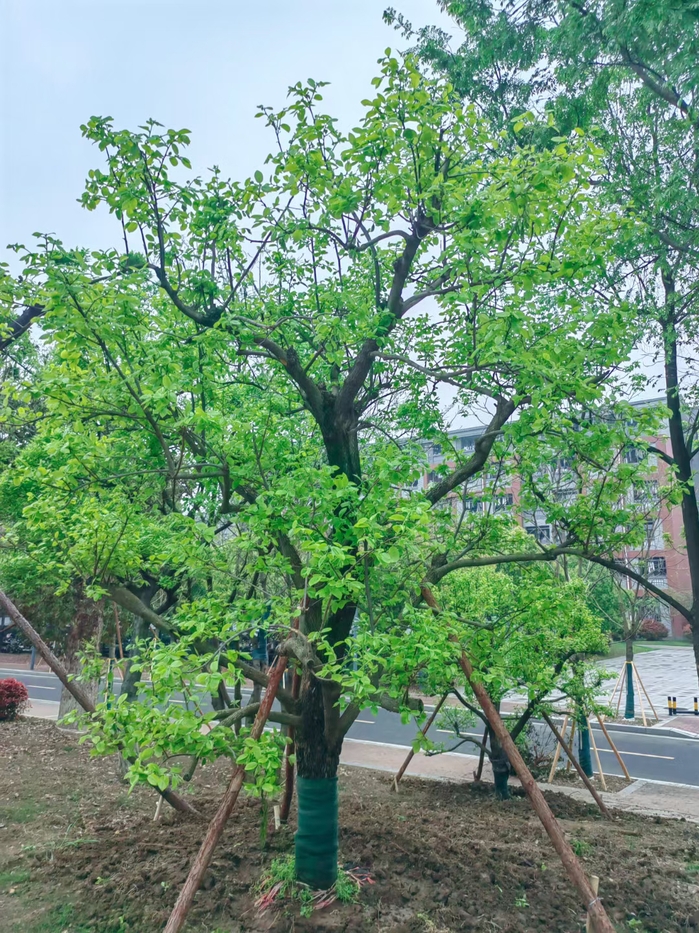 本次捐种的树木品种包括枣树、石榴树、柿子树等,共计8棵,树形开阔笔挺,枝叶葱茏。其中一株树龄达120年的枣树,与我校118年的办学史几乎同岁,堪称“树王”,更是古韵沧桑,独具风华。这批树木目前被分别栽种在行政管理中心左前方、计算机信息工程学院右前方、电气信息工程学院右后方、明湖与一食堂之间等位置的绿化带中,彼此遥相呼应、联缀成景,以满树青翠共同为学校增添色彩与活力。