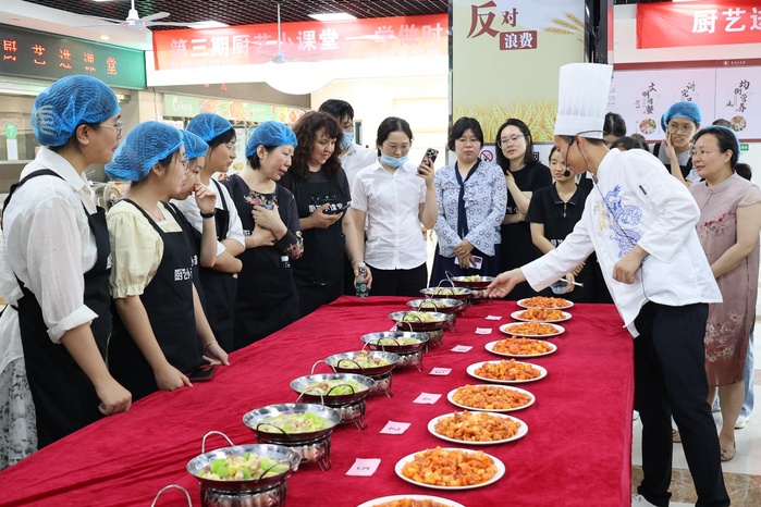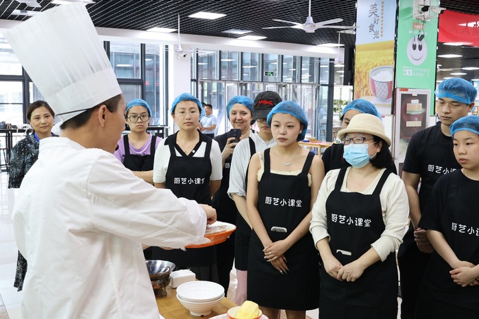 校党委常委、副校长刘春节随堂听课并与学员亲切交流。后勤管理处处长王文做课前动员。他表示,厨艺课堂是学校后勤参与“三全育人”、践行“五育并举”的有力举措,是后勤管理处党支部党建引领主动融入实践育人教学体系的重要载体;劳动教育是人才培养“五育并举”的重要基石,将课堂搬进厨房,通过现场教学与实操,希望师生学员们能够深入了解美食文化渊源,切身体验劳动制作的过程,真正感受劳动成果的美好。