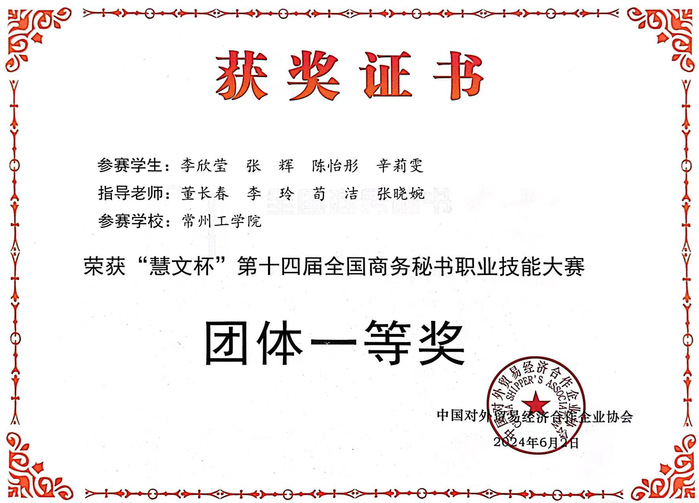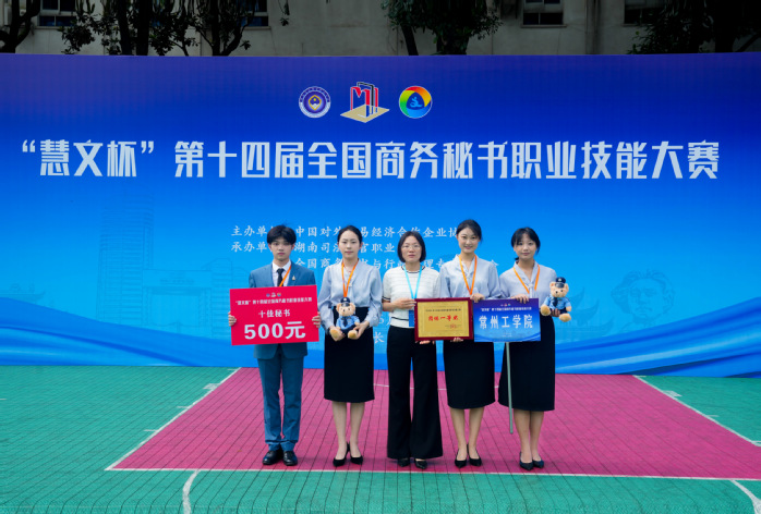 6月2日,由中国对外贸易经济合作企业协会主办、全国商务秘书与行政助理专家委员会等单位承办的“慧文杯”第十四届全国商务秘书职业技能大赛落下帷幕。由人文学院秘书学专业学生李欣莹、张辉、陈怡彤、辛莉雯组成的参赛队荣获本科组团体一等奖,张辉荣获“十佳秘书”称号,领队董长春老师荣获“优秀裁判”称号。