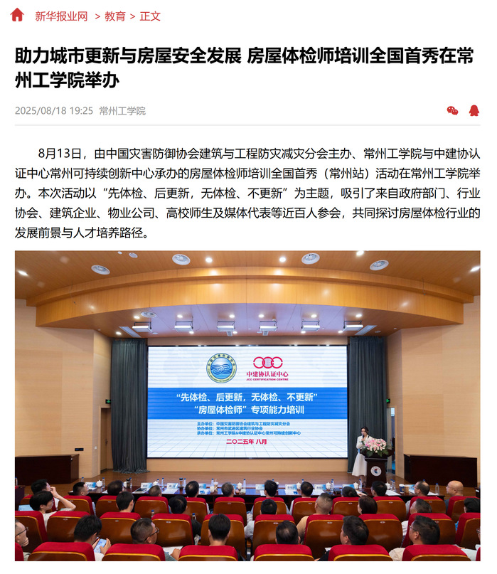 8月13日,由中国灾害防御协会建筑与工程防灾减灾分会主办、常州工学院与中建协认证中心常州可持续创新中心承办的房屋体检师培训全国首秀(常州站)活动在常州工学院举办。本次活动以“先体检、后更新,无体检、不更新”为主题,吸引了来自政府部门、行业协会、建筑企业、物业公司、高校师生及媒体代表等近百人参会,共同探讨房屋体检行业的发展前景与人才培养路径。