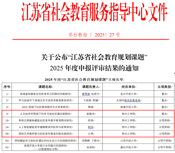 近日,江苏省社会教育服务指导中心正式公布2025年度江苏省社会教育规划课题评审结果,我校赵振杰、陈艳、祝伟、王燕四位教师申报的四项课题均成功通过评审,获批立项。