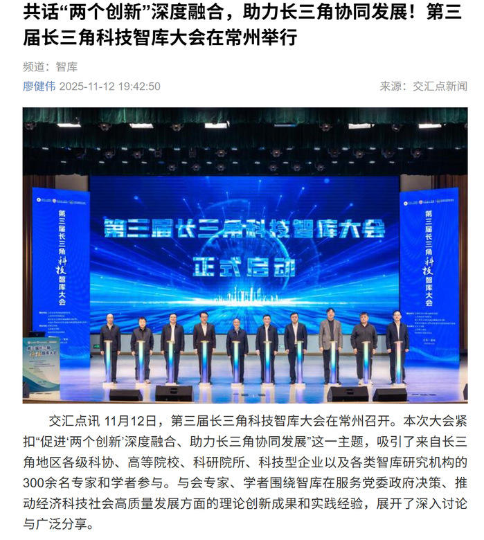 交汇点讯 11月12日,第三届长三角科技智库大会在常州召开。本次大会紧扣“促进‘两个创新’深度融合、助力长三角协同发展”这一主题,吸引了来自长三角地区各级科协、高等院校、科研院所、科技型企业以及各类智库研究机构的300余名专家和学者参与。与会专家、学者围绕智库在服务党委政府决策、推动经济科技社会高质量发展方面的理论创新成果和实践经验,展开了深入讨论与广泛分享。