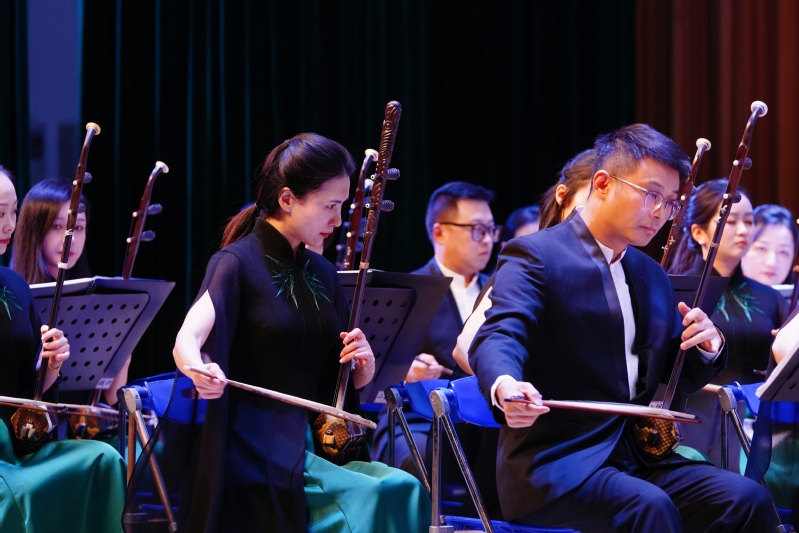 演出过程中,乐团演奏家们以饱满的热情、娴熟的技巧诠释作品的深厚内涵,每一个音符都传递着对江南文化的热爱与对民族精神的赞颂。舞台上,乐手们默契配合、神情专注;舞台下,师生们全神贯注、沉醉其中。不少同学拿出手机记录下精彩瞬间,眼神中满是对民族音乐的喜爱与赞叹。