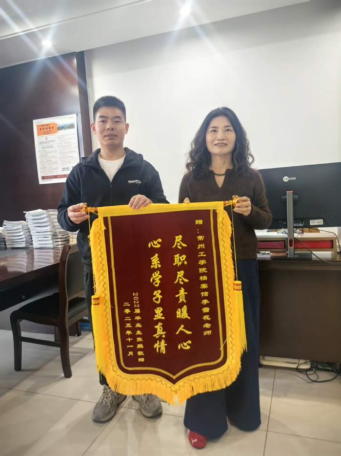 12月2日,冬日暖阳洒满校园。这一天,刚考上东华大学硕士研究生的2022届校友张鹏专程从上海赶回母校,将一面写有“尽职尽责暖人心 心系学子显真情”的鲜红锦旗,郑重地送到档案馆李雪花老师手中。