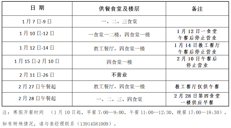 根据学校2025-2026学年第一学期结束和新学期开学安排及师生需求实际情况,现将寒假期间后勤保障服务项目安排通知如下: