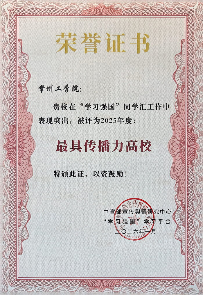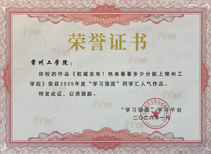 近日,“学习强国”同学汇2025年度评选结果揭晓。我校获中宣部宣传舆情研究中心、“学习强国”学习平台授予的“最具传播力高校”荣誉称号。同时,由党委学生工作部策划制作的作品《权威发布!快来看看多少分能上常州工学院》获评2025年度“学习强国”同学汇人气作品。